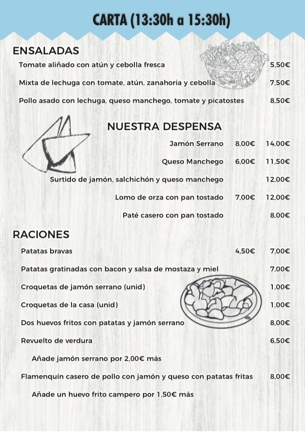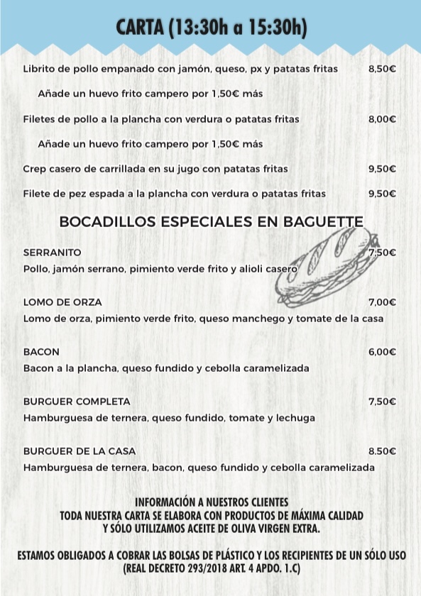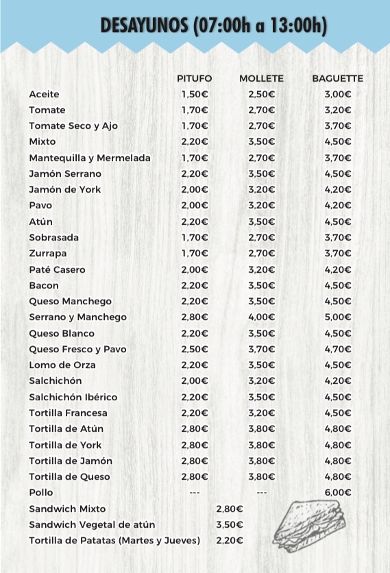 The menu offers a variety of coffee selections alongside a range of light food options typical of a café setting. Visitors can expect traditional coffee beverages including espresso-based drinks and specialty options such as Cafe Con Leche. Light bites are available, featuring local sandwich choices like Pitufo de Lomo de Horza and Pitufo de Lomo Y Tostada Con Tomate, as well as classic café snacks such as Patatas Bravas. The menu is suitable for breakfast, coffee breaks, or casual light meals throughout the day.